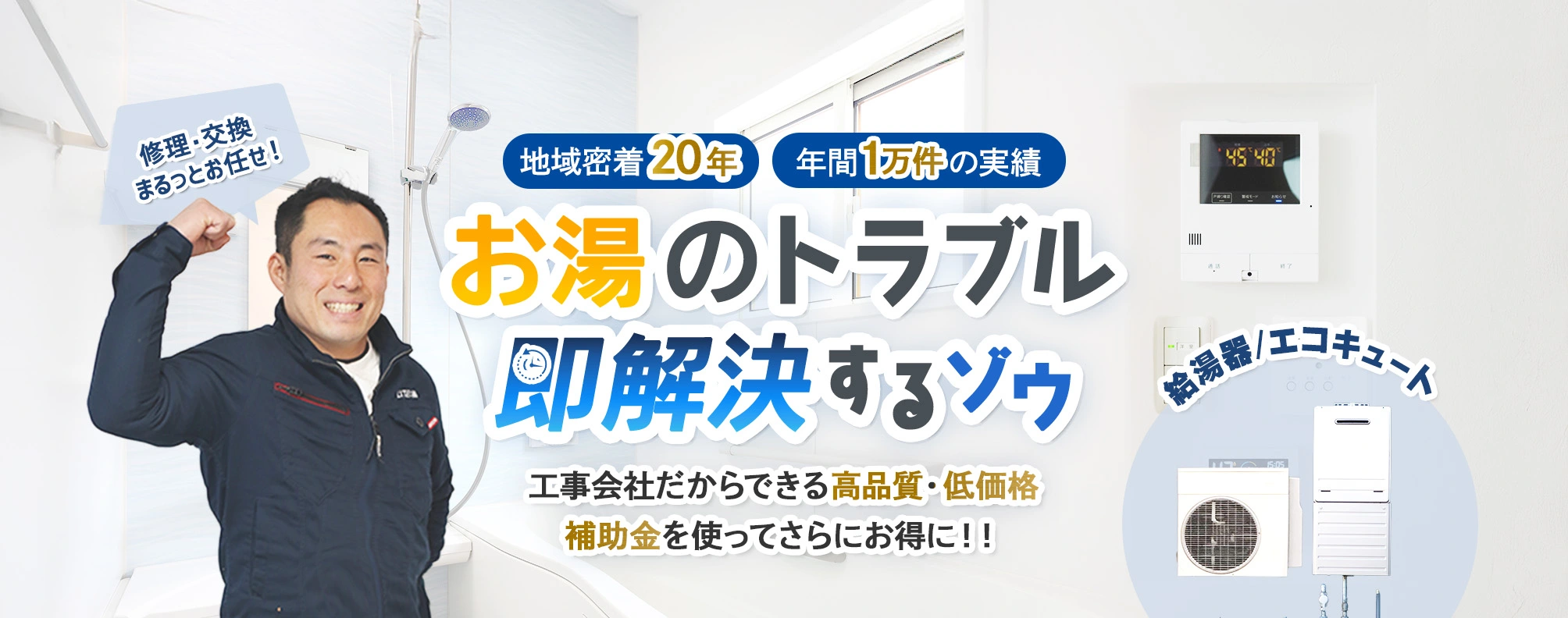 給湯器のエラー、お湯が出ない、お湯の量が設定より多い・少ないといったお悩みから故障、ご相談までスピードワンストップ対応可能なかえゾウくんにお任せください!